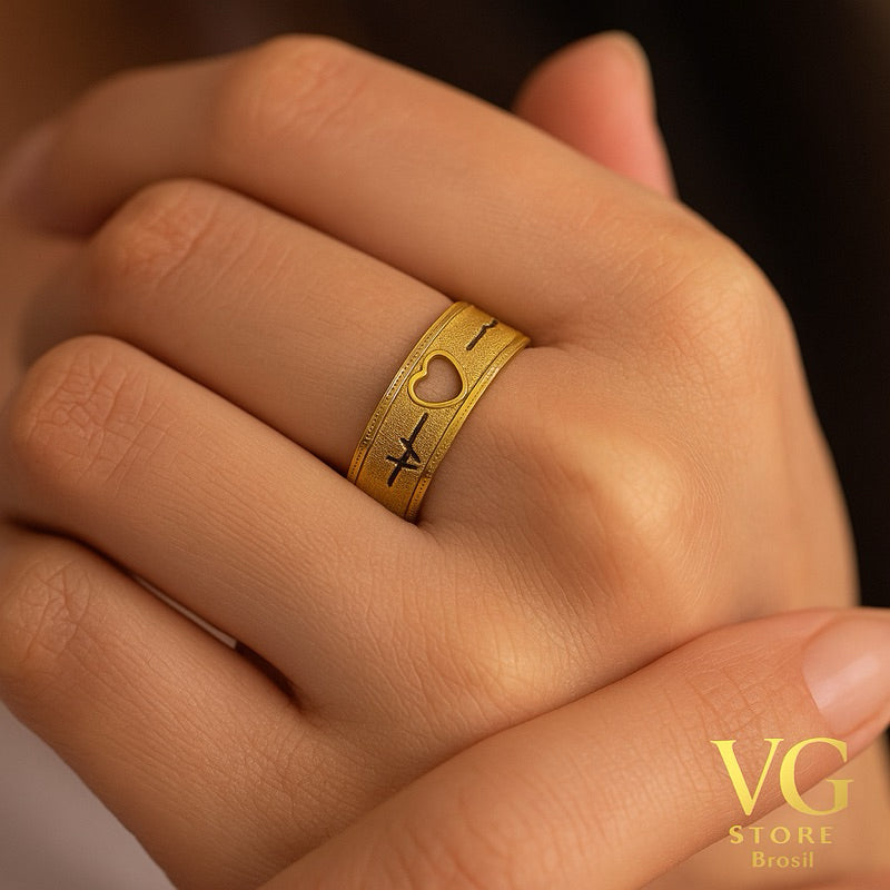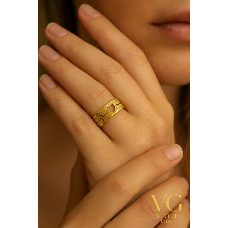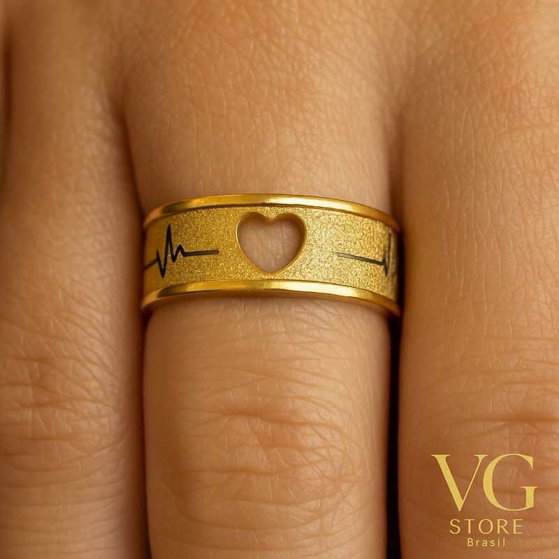 O amor tem um ritmo próprio — e essa aliança eterniza esse sentimento. A Love Pulse traz um design único com acabamento dourado fosco e detalhes em alto-relevo que combinam batimentos cardíacos com um coração vazado no centro. Uma peça que pulsa emoção e representa a conexão entre duas almas.