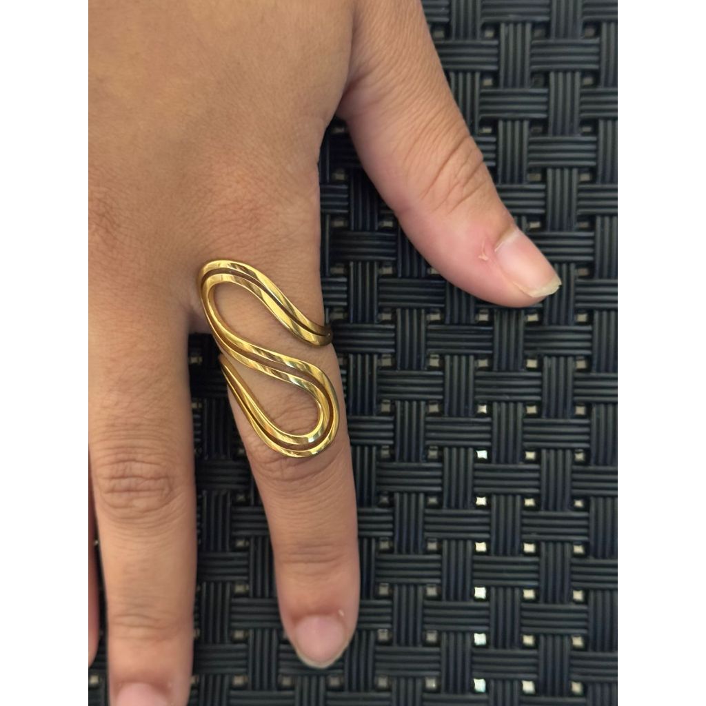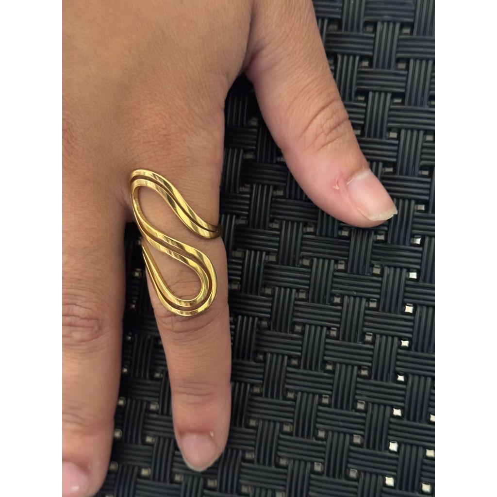 Descubra o poder das formas com o Anel Curvas Douradas, uma peça sofisticada e cheia de personalidade. Seu design fluido e moderno em formato ondulado cria um visual impactante, ideal para quem ama estilo e exclusividade.
