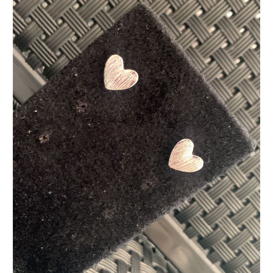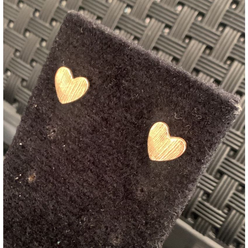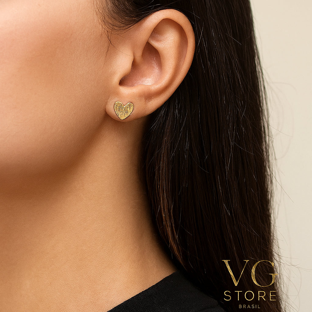 Brincos pequenos em formato de coração. Eles possuem um acabamento liso com textura riscada na superfície, que cria um efeito fosco e levemente reflexivo. O design é minimalista e compacto, sem pedras ou detalhes adicionais, proporcionando um visual delicado e discreto, que contrasta com o tom metálico das peças e destaca seu formato.