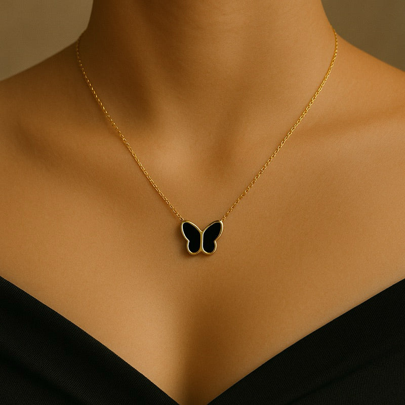 Encante-se com a delicadeza deste colar em aço inoxidável com pingente de borboleta. Disponível em duas versões sofisticadas — uma com acabamento em madrepérola e outra em esmalte preto brilhante — ele é perfeito para realçar a feminilidade com um toque moderno e atemporal. Hipoalérgico, resistente à água e com brilho duradouro, é ideal para uso diário ou para compor um look elegante à noite.