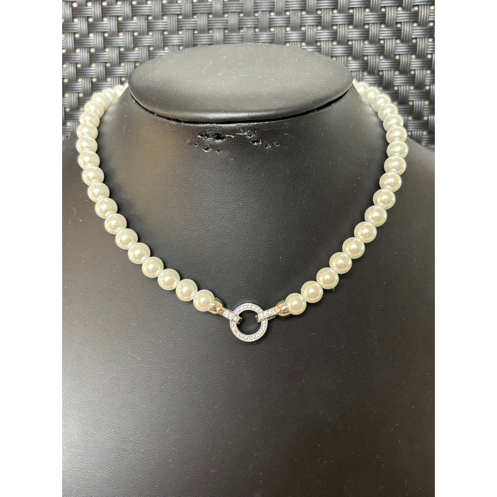 Colar de Pérolas com Fecho Frontal em Círculo Cravejado – Elegância Atemporal