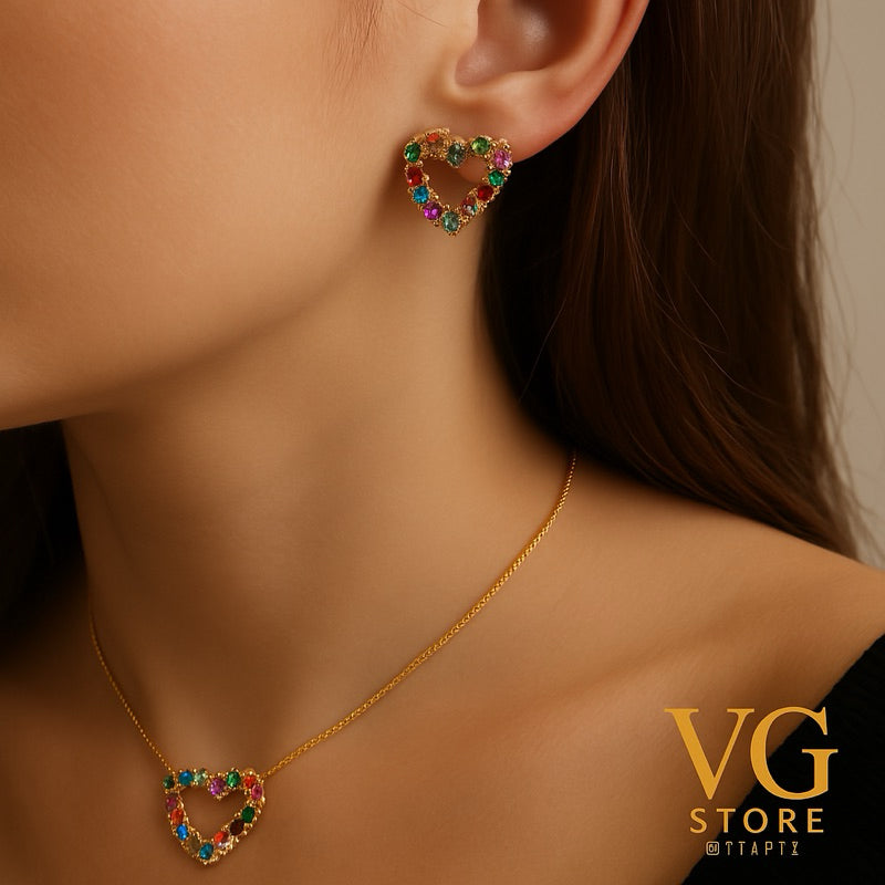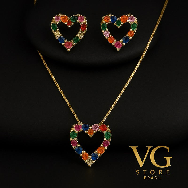 Romântico, delicado e cheio de brilho! Este conjunto traz um colar com pingente em formato de coração todo cravejado, acompanhado de brincos no mesmo design. Uma joia encantadora que combina com qualquer ocasião – seja para o dia a dia ou momentos especiais.