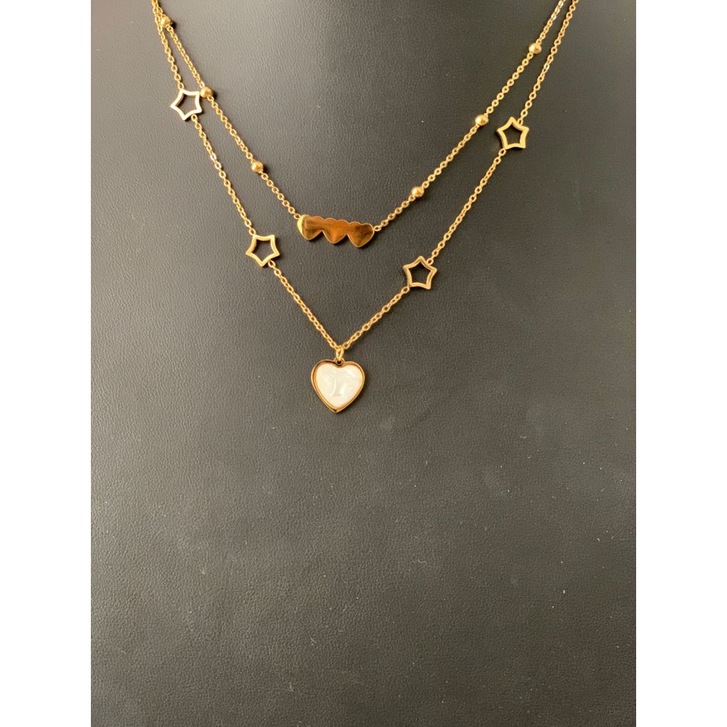 Duas camadas de puro encanto em um único acessório! Este colar duplo combina a delicadeza dos corações pretos com o charme moderno das estrelas vazadas e o toque clássico de um pingente de coração espelhado. Produzido em aço inoxidável de alta durabilidade, é resistente à água, ao suor e não desbota com o tempo. Ideal para quem ama acessórios românticos, modernos e versáteis para o dia a dia ou ocasiões especiais.