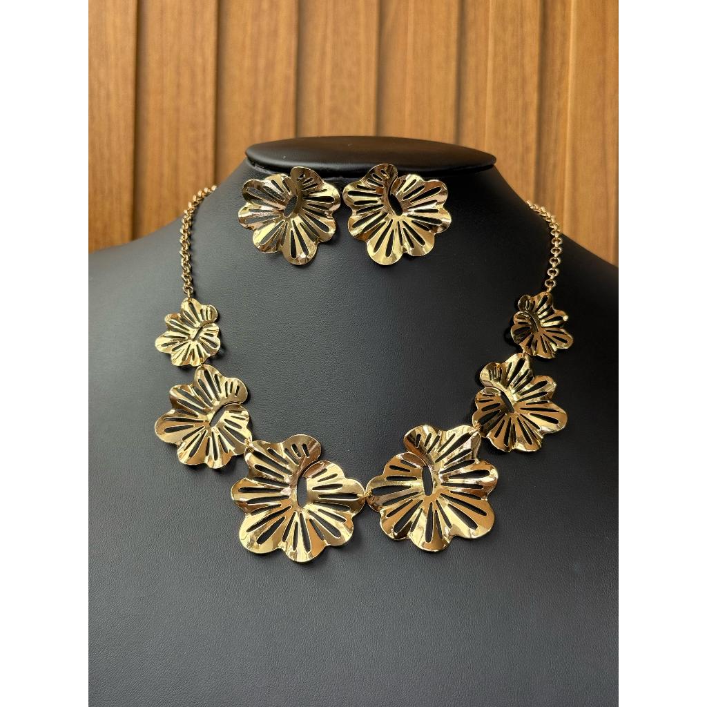 O colar e os brincos em formato floral vazado trazem um efeito moderno e ousado, ideal para quem gosta de acessórios que fazem a diferença. Com um toque de brilho sutil e um formato que valoriza o rosto e o colo, essa peça adiciona um ar de glamour e sofisticação ao seu visual.