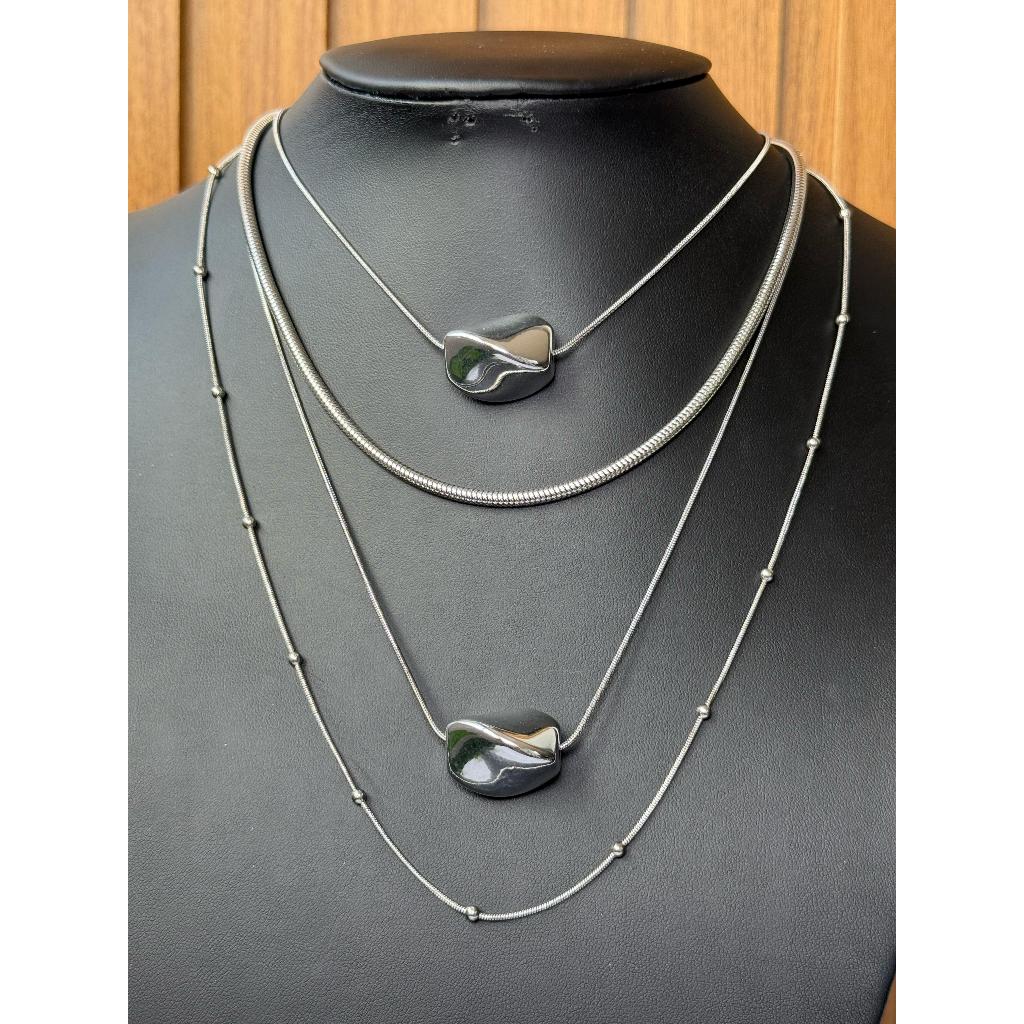Transforme seu visual com o Colar Triplo Metalizado, uma peça moderna e cheia de personalidade. Composto por três camadas de correntes finas e pingentes metálicos de design orgânico, este acessório é ideal para quem busca sofisticação com um toque contemporâneo.
