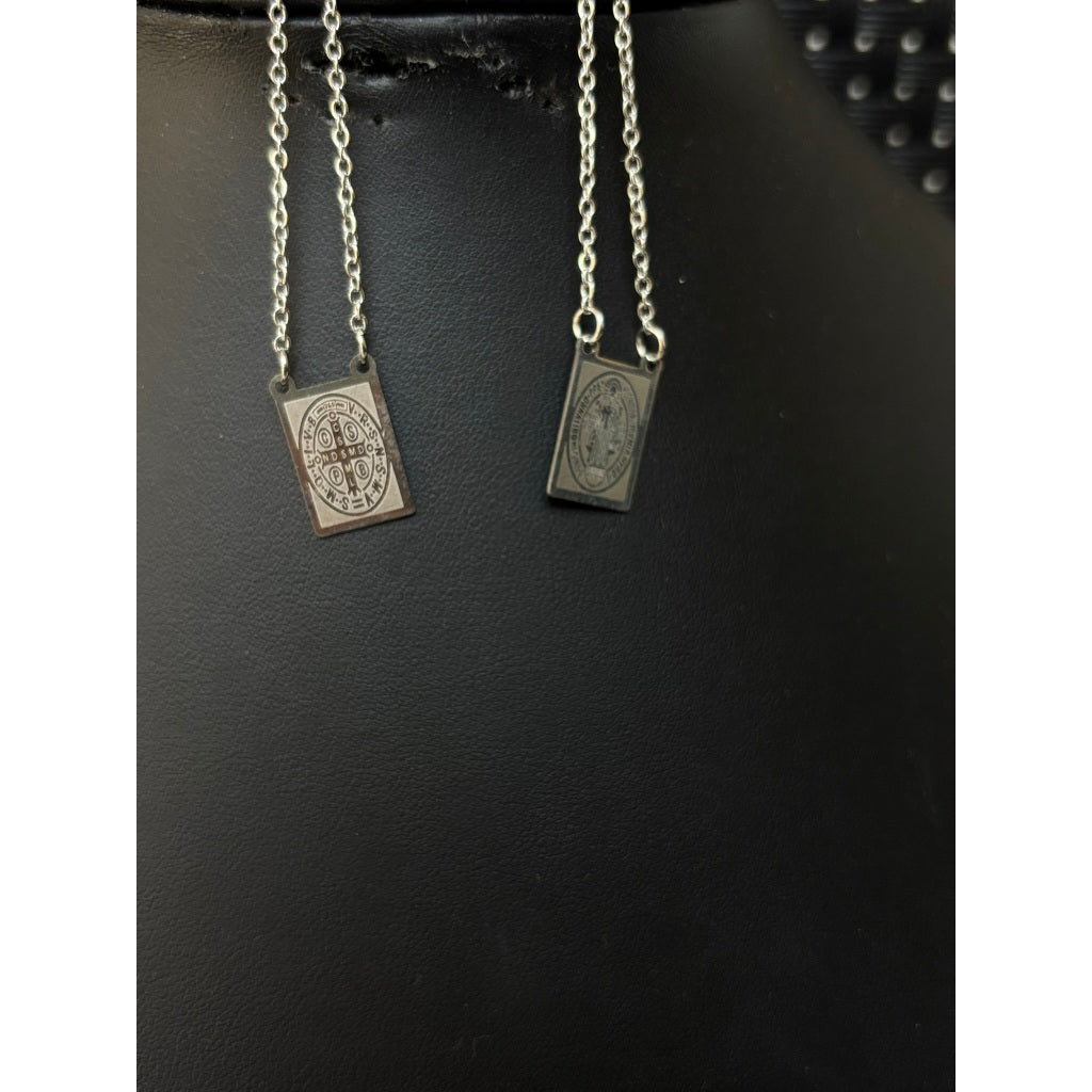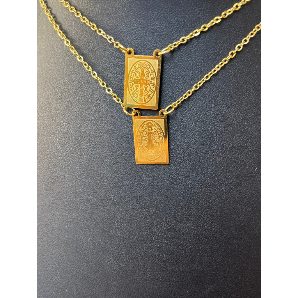 Este colar duplo apresenta a tradicional Medalha de São Bento, conhecida por sua poderosa oração de proteção espiritual. Com gravações detalhadas dos dois lados — frente com a imagem de São Bento e verso com a cruz e a oração — é ideal para quem busca segurança, paz interior e fé no dia a dia.