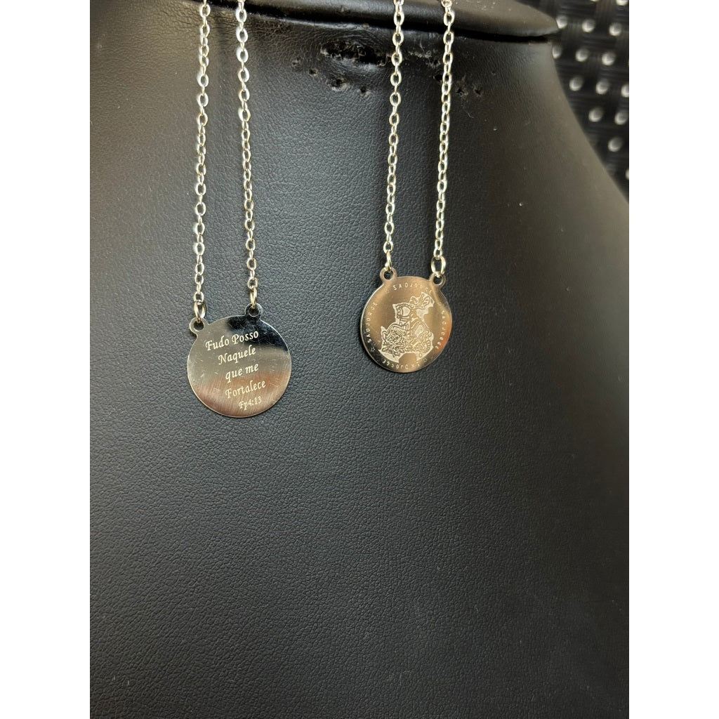 Este colar masculino em aço inoxidável traz duas medalhas redondas gravadas: