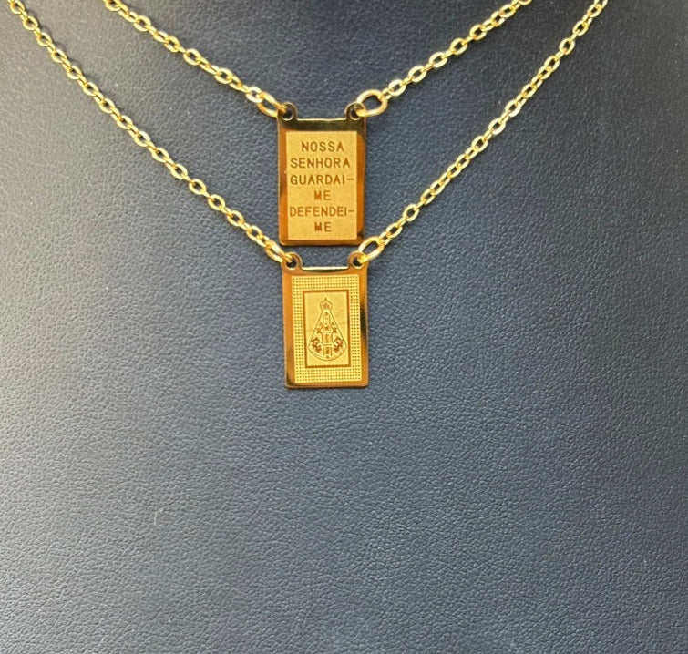 Este escapulário em aço inoxidável dourado une beleza e espiritualidade com duas plaquinhas delicadas: uma com a imagem de Nossa Senhora Aparecida e outra com a oração “Nossa Senhora, guardai-me, defendei-me”. Ideal para uso diário como símbolo de proteção e bênção.