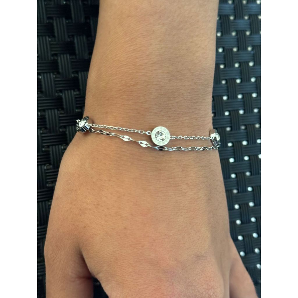 Refinada e atemporal, essa pulseira dupla em aço inoxidável traz dois pontos de luz com zircônias centrais cravejadas em molduras . O design elegante, com correntes finas e detalhes delicados, garante um toque de brilho e classe ao visual.