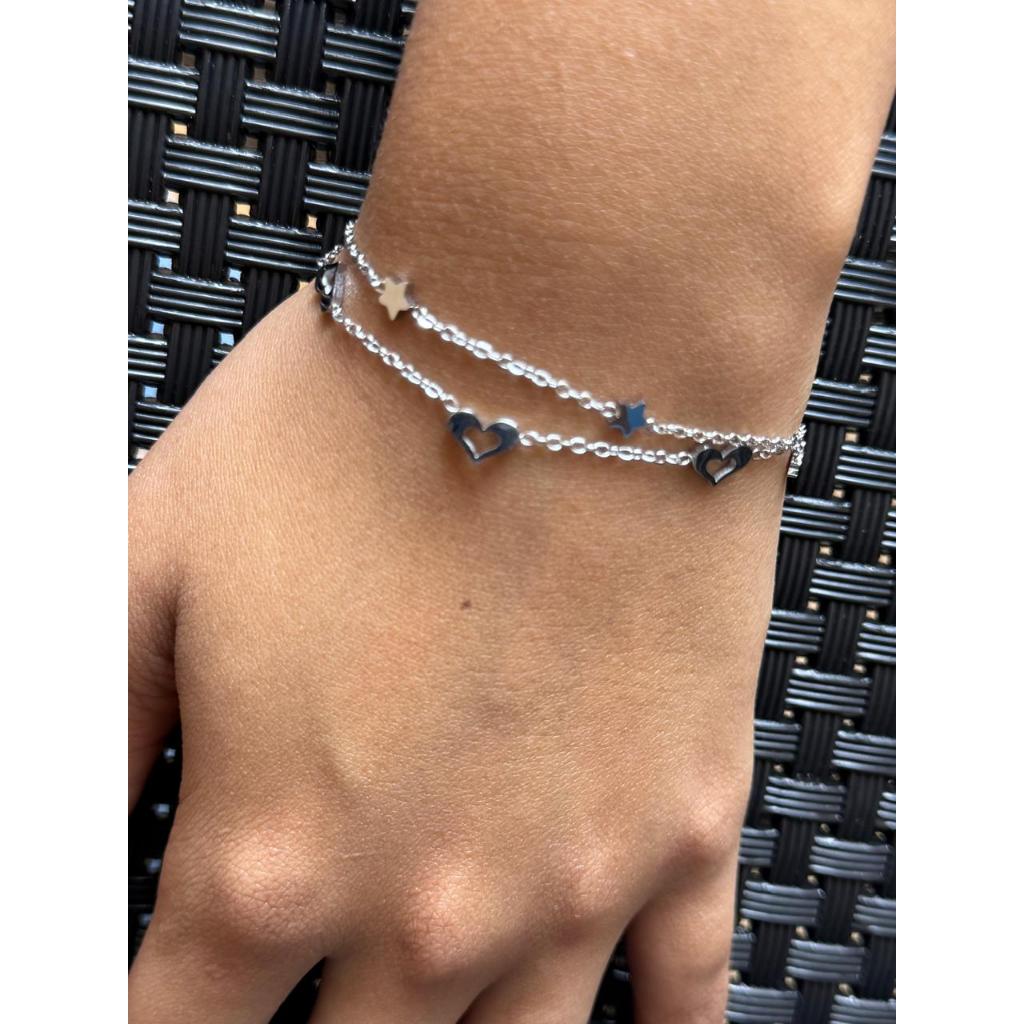 Delicadeza e charme reunidos em um só acessório! Essa pulseira dupla em aço inoxidável dourado traz pingentes de corações e estrelas que simbolizam amor, brilho e leveza.