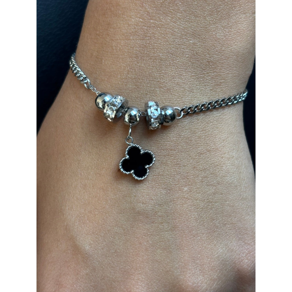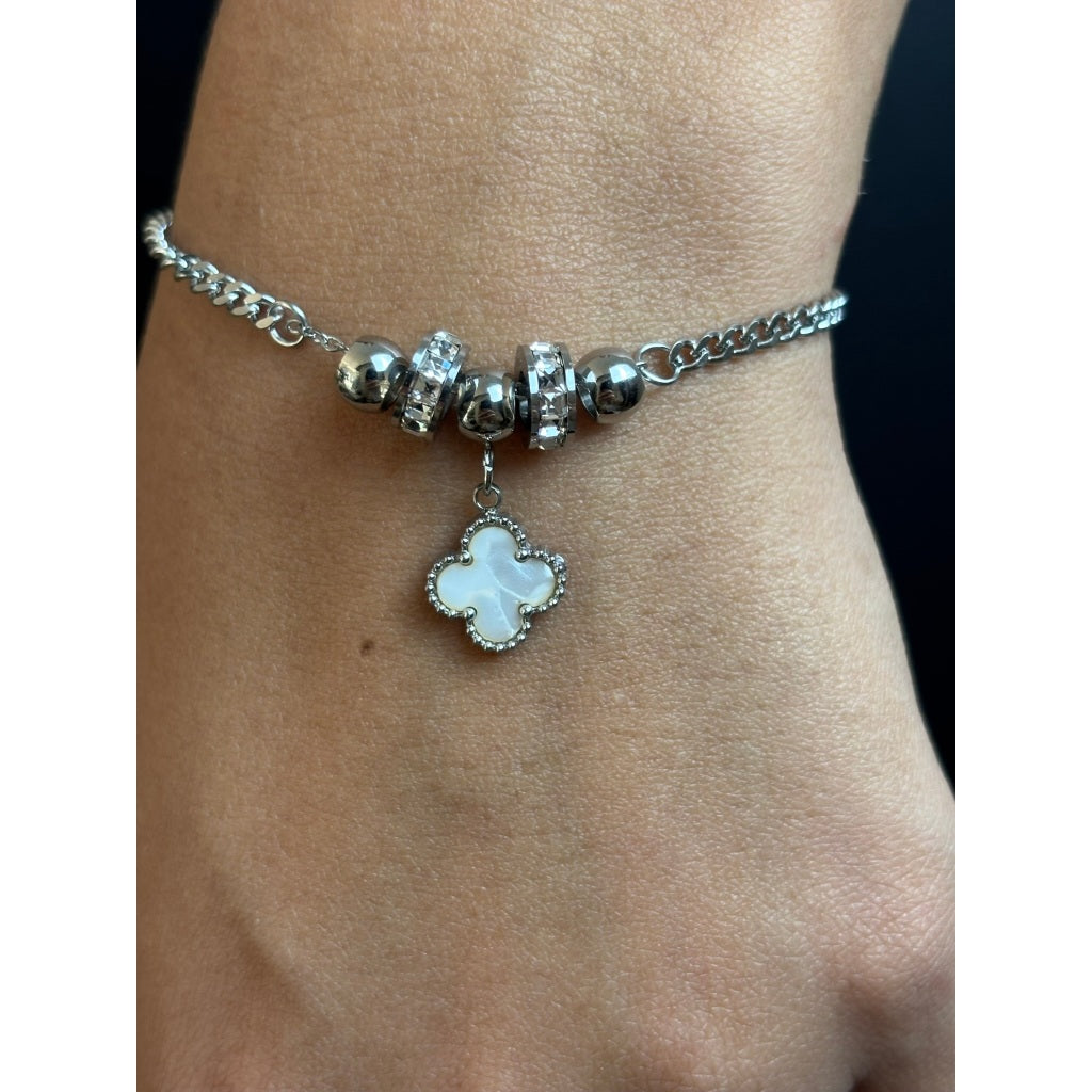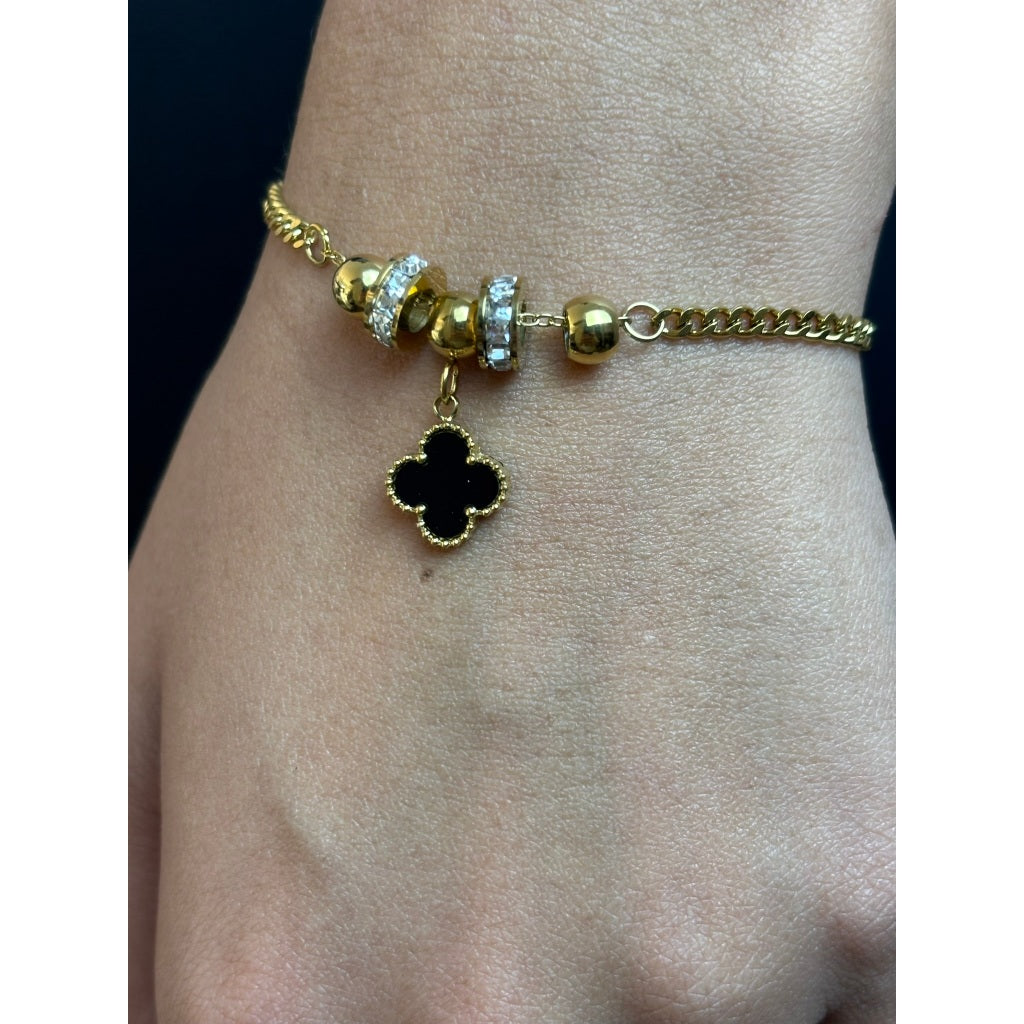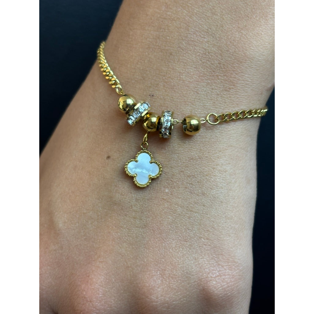 Com elos dourados, berloques cravejados e um pingente em trevo, essa pulseira transmite elegância e proteção com muito estilo. Ideal para compor looks marcantes e modernos.